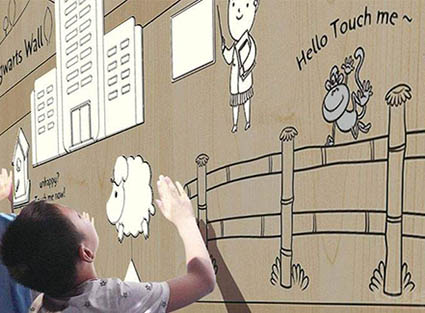 霍格沃茲墻是多媒體互動投影鐘具有魔法的一面互動展示墻,通過手指觸碰墻面上,影像就會如魔法般一樣出現,不觸碰時就會消失。
